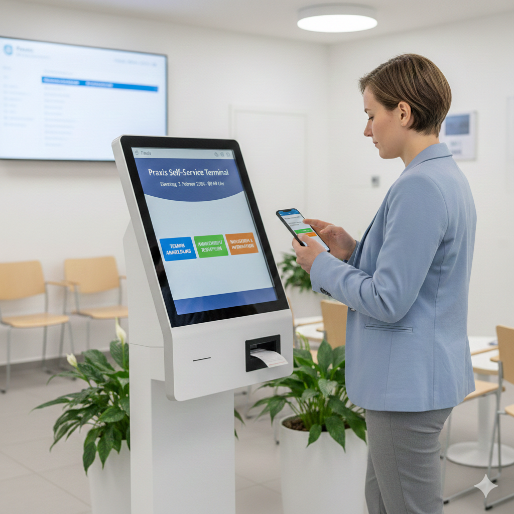 Patienten checken selbstständig ein (eGK) und bezahlen Rechnungen am Terminal.